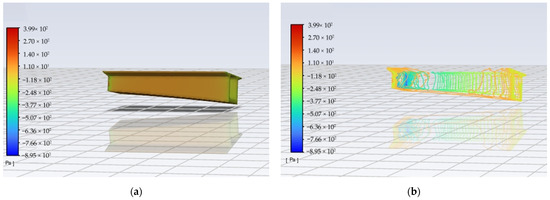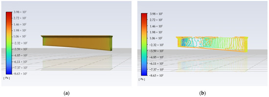 The segmented models are imported into Fluent for three-dimensional external-flow simulations. For each girder segment, computations are performed under 11 angles of attack (α ∈ [−10°,10°], step 2°). For every case, surface pressure contours and streamline plots are produced. Taking Segment 1 as an example, the pressure and streamline fields at α = 0° are shown in Figure 13, and those at α = 10° are shown in Figure 14.