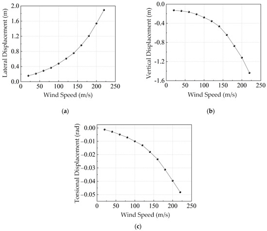 (3) Aerostatic baseline and stability. An APDL FE model was built for the construction stage. The displacement–wind speed curves indicate a critical aerostatic wind speed of about 140 m/s. At the test wind speed 28 m/s and the design wind speed 34.52 m/s, the structure remains in a stable operating range, serving as the baseline for buffeting superposition.