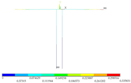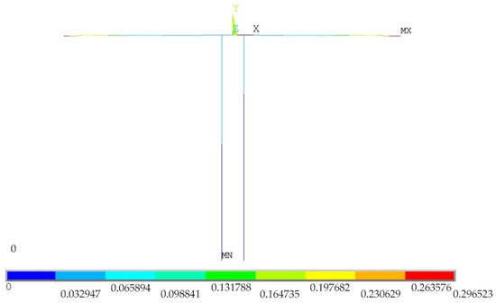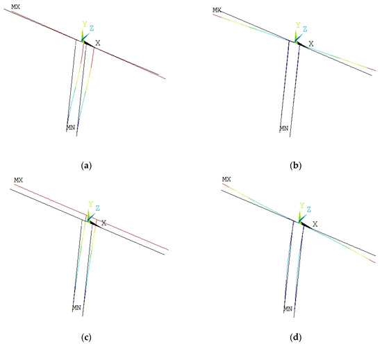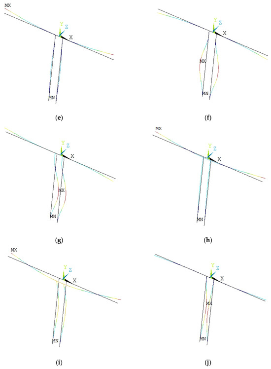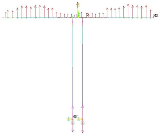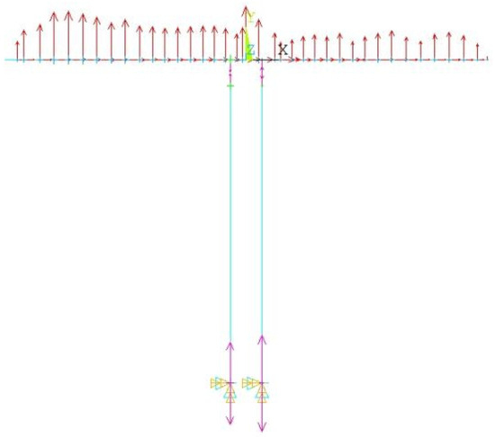 Using APDL secondary development, a time-domain buffeting analysis was performed. The nodal loading layout for the construction-stage girder is shown in Figure 31 and the global deformed shape is shown in Figure 32.