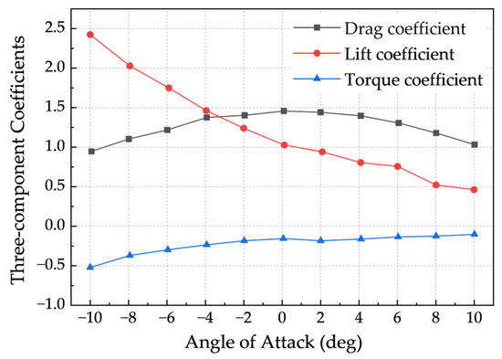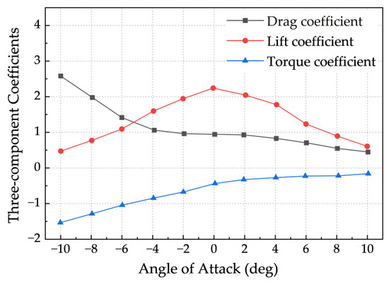 The static three-component coefficients provide a dimensionless characterization of the aerodynamic behavior of a bridge deck under mean wind, corresponding to along-wind drag, vertical lift, and the torsional moment about the deck’s axis. They are key inputs for buffeting, vortex-induced vibration, galloping, and aerostatic stability analyses, and their accuracy directly affects the reliability of wind-resistant assessment [27,28]. In practice, the coefficients are reported in two coordinate systems: the body axis system (FH, FV, FM) and the wind axis system (FD, FL, Mz). Taking the inflow direction as the reference, the wind axis expressions for the static wind loads are given in Equations (21)–(23) [29].