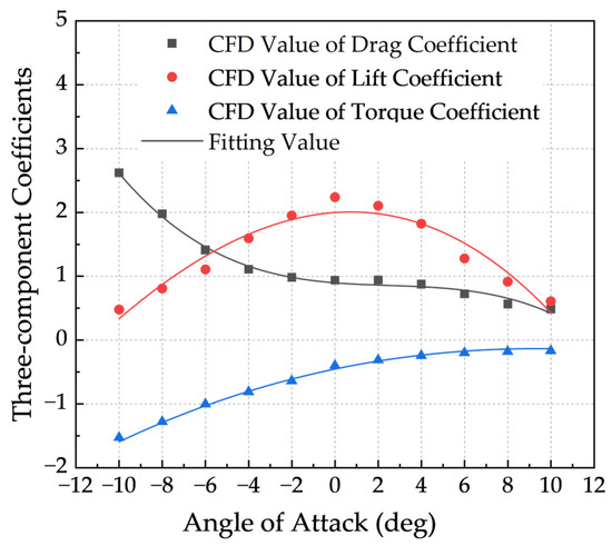 From the test results, the drag coefficient attains a larger value near small negative angles of attack and then decreases slowly as α increases; the lift coefficient increases and then decreases as α varies from negative to positive, peaking at a small positive angle; the side force coefficient increases monotonically with α (rising from negative toward zero); the rolling moment coefficient exhibits a “U”-shaped trend and is sensitive to small positive α; the yawing moment coefficient generally increases with α with a slight drop at larger positive angles; and the pitching moment coefficient decreases approximately monotonically with α. Compared with the three-component results, these features further reveal the influence of force–moment coupling in the small α range. For subsequent time-domain analysis, the relationships between the six-component coefficients and α are fitted using cubic polynomials (Equations (58)–(63)). The fitted curves match the test data well, as shown in Figure 29.