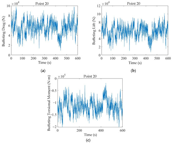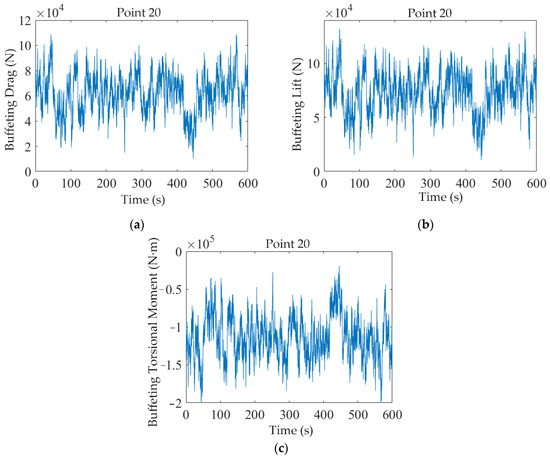 Using the wind tunnel-derived coefficient–angle-of-attack fits (Equations (55)–(60)) and their derivatives (Equations (61)–(66)), the instantaneous angle of attack α(t) from the fluctuating wind is substituted at each time step to obtain the force and moment coefficients. These are then converted, as needed, to the wind axis three-component form and substituted into the Davenport quasi-steady relations (Equations (27)–(29)), together with the synthesized wind speeds, to generate the segment-wise line load time histories of the drag, lift, and pitching moment, as shown in Figure 30.