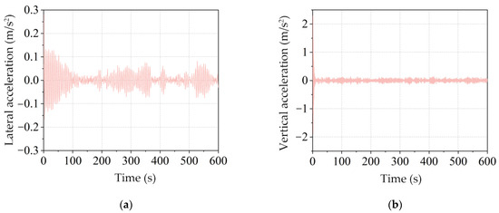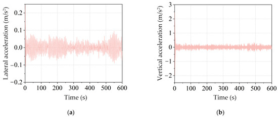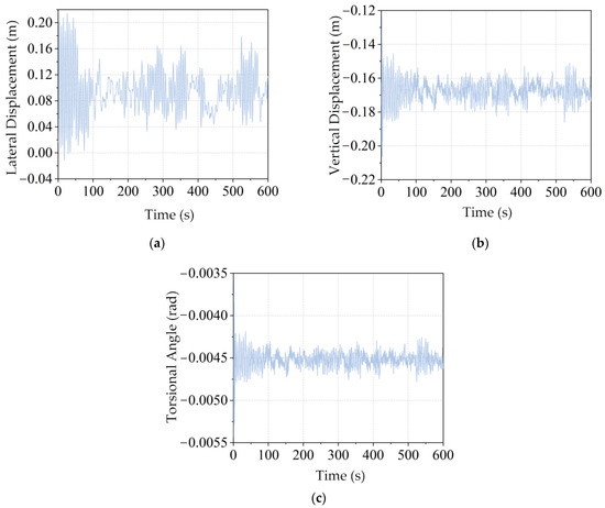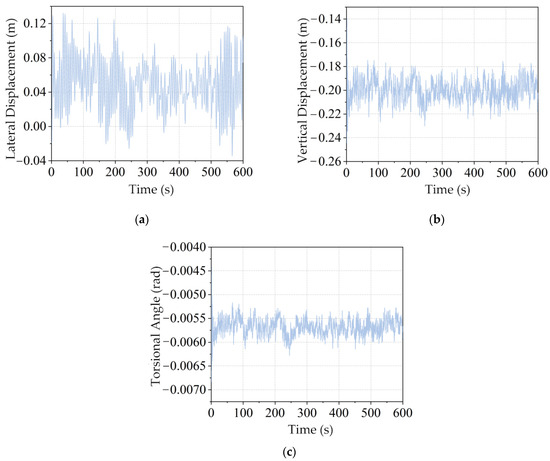 The deformation plot indicates that the right cantilever tip is the controlling location, while the midspan deformation is relatively small. Accordingly, that tip section is selected as the representative location: its lateral and vertical acceleration time histories (Figure 33) exhibit zero-mean, narrow-band random fluctuations; the displacement and torsional angle time histories (Figure 34) show lateral displacement fluctuating around approximately 0.12 m, vertical displacement around −0.18 m, and torsional rotation around −4.5 × 10−3 rad, with no drift trend, indicating linear elastic behavior at the present wind speed level.