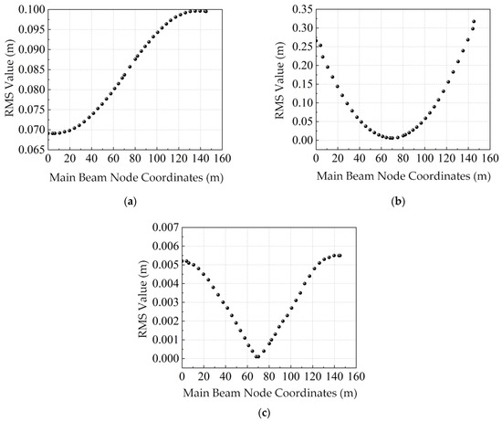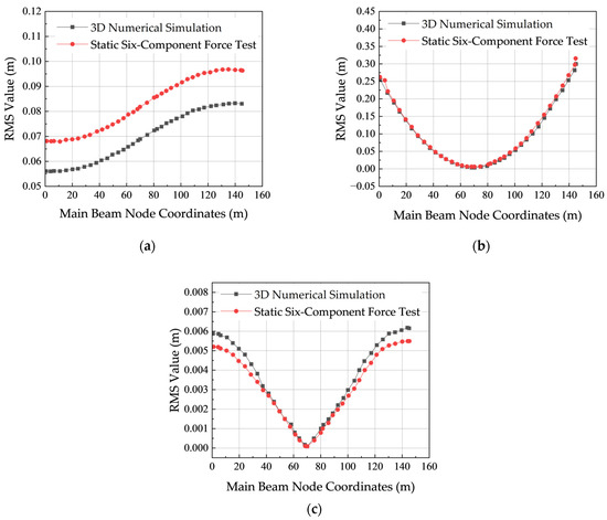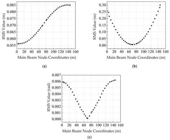 Comparison of nodal RMS displacements of the main girder: (a) comparison of RMS lateral displacement of the main girder; (b) comparison of RMS vertical displacement of the main girder; (c) comparison of RMS torsional rotation of the main girder.