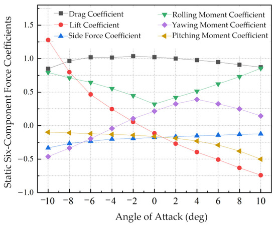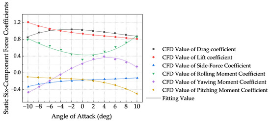 By differentiating the fitted functions with respect to the angle of attack, the derivative angle-of-attack relations for the static six-component coefficients are obtained (Equations (64)–(69)). The statistical results of the derivatives of the six-component coefficients are summarized in Table 10.
