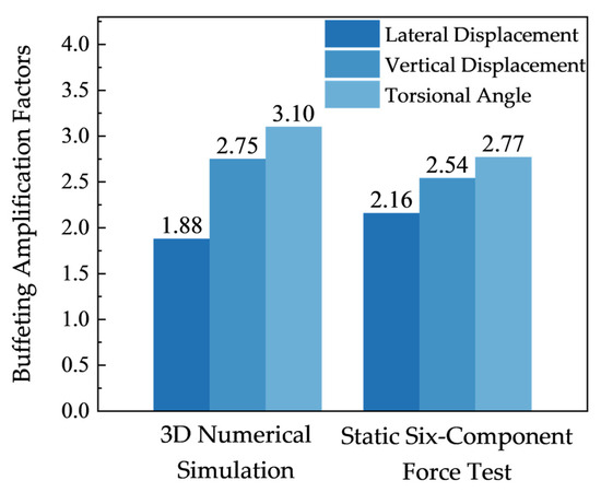 The buffeting amplification factor quantifies the increase in the total wind-induced response relative to the aerostatic response under the action of fluctuating wind, and is an important parameter for design and safety evaluation [34,35]. As seen in Figure 36, the numerically simulated amplification factors (lateral displacement, vertical displacement, and torsional rotation) exhibit a mean, standard deviation, and coefficient of variation of 2.58, 0.63, and 24.38%, respectively; the wind tunnel measurements yield corresponding values of 2.49, 0.31, and 12.37%. Thus, the amplification factors obtained using the six-component wind tunnel inputs are smaller and exhibit a narrower spread than those from the numerical three-component inputs, indicating improved accuracy and reduced uncertainty when the six-component coefficients are employed.