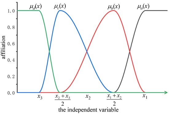 The standard “GB 50068-2018 Unified Standard for Reliability Design of Building Structures” [] specifies the safety grading standards for existing masonry components with a safety grade of Grade II, as well as the corresponding target reliability indices, as shown in Table 3. Although using the member’s reliability index in order to rate existing masonry members is more accurate, there is the problem of sudden changes in the rating near the boundary region. For example, although β = 3.1999 and β = 3.2001 are very close, they span two safety levels. The problem of sudden rating changes in the boundary region can be solved by the affiliation rating method. The affiliation functions of the au level, bu level, cu level, and du level are shown in Equations (11)–(14), respectively, and their function images are as shown in Figure 1. The affiliation set of the members can be obtained from the affiliation function.