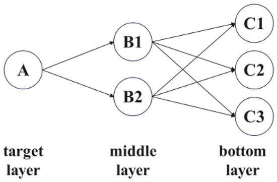 The recursive hierarchical model for a masonry structure is shown in Figure 2. The top layer (target layer) is the overall reliability index A; the middle layer (criterion layer) contains member damage hazard B1 and inter-component correlation coefficient B2, which affect the top layer (target layer); and the bottom layer (scheme layer) consists of basic independent elements such as element type (C1), location (C2), and number of floors (C3), which are independent and cross-influence the criterion layer (e.g., a single program-level factor can act on single/multiple criterion-layer factors). At the same time, criterion and scheme layers are sometimes interchangeable. For example, in masonry structures, where different floors have different effects on the overall structural safety, floors can also be used as the second layer, and element types and locations as the third layer.