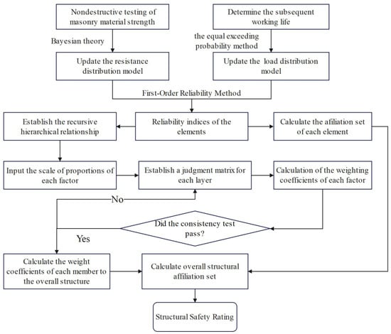 The practice of the assessment of the safety of existing masonry structures is related to the safety of people’s lives and property. However, the current assessment method, described in “GB50292-2015 Standard for appraisal of reliability of civil buildings”, fails to fully consider the uncertainty-related characteristics of the structures, which easily leads to unreasonable assessment results. This paper proposes a method of safety assessment for existing masonry structures that considers the updating of resistance and load probability models and different member weights. First, based on the resistance probability model measured in the field, the resistance model in the current code (GB50292-2015) is updated through Bayesian theory. Then, the variable load model is updated for different subsequent working years through the equal-exceeding-probability method. Finally, the safety grade of the existing masonry structure is obtained by the analytic hierarchy process, using the affiliation set as the assessment index. This method of analysis solves the problem relating to the “jump” in the middle of the break-point of the traditional safety grading standard. It also fully considers the uncertainty-related characteristics of the existing structure, and its evaluation results align with the existing structure’s actual situation, which is critical to the assessment of the safety of the existing masonry structure.