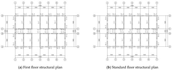 The structure is a five-story existing brick masonry house with a subsequent working life of 30 years; the height of the first floor is 3.500 m, and the height of the other floors is 2.700 m. The strength grade of the brick is MU10 (the average value of the on-site measurements is 11.0 MPa, and the coefficient of variation is 0.18), and the strength grade of the mortar is M1.0 (the average value of the on-site measurements is 1.1 MPa, and the coefficient of variation is 0.04). The thickness of both the internal and external brick walls is 240 mm. The masonry house is load-bearing by means of its transverse walls. The masonry weight is 18 kN/m3, the permanent floor load is 4.0 kN/m2, the floor live load is 2.0 kN/m2, the stairwell permanent load is 7.0 kN/m2, the stairwell live load is 3.5 kN/m2, the roof permanent load is 5.0 kN/m2, and the roof live load is 0.5 kN/m2, while the first floor and the standard floor plan are structurally planned as shown in Figure 4. Walls with numerical axis designations are transverse walls, while walls with alphabetic axis designations are longitudinal walls. Components are numbered in the format “number1–number2”, where the first digit represents the wall number and the second digit denotes the wall segment number. For example, component 15-1 in Figure 4a indicates the first wall segment of transverse wall 15.