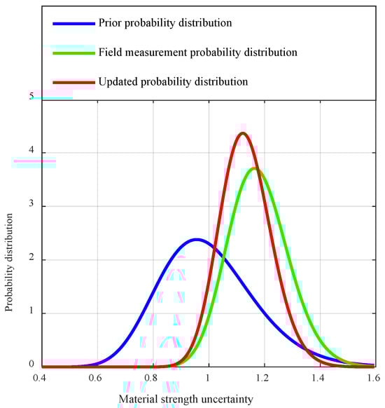 Due to the limited number of measured samples, measured probability distribution parameters generally do not accurately reflect the actual situation of the structure. However, the prior probability model and distribution parameters are known during the structural design process, so the prior probability model can be updated based on the measured probability model, and a posterior probability distribution that is congruent with the characteristics of the existing building can be obtained through the Bayesian equation, Equation (4).