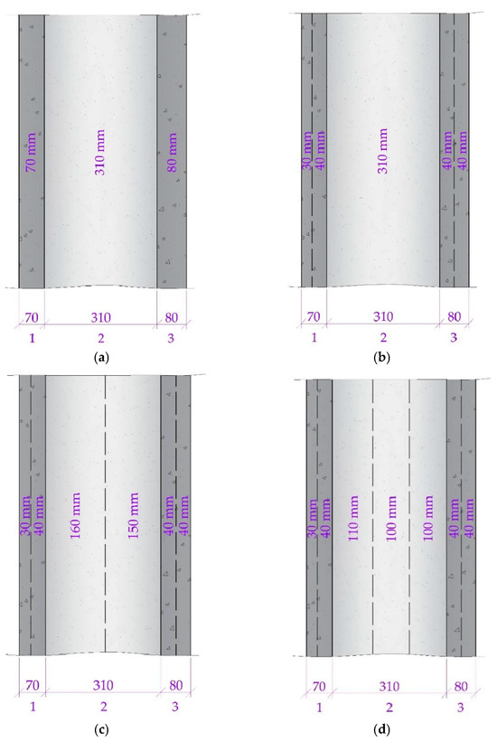 Panel design variants (Scheme 1, Scheme 2, Scheme 3 and Scheme 4) for analyzing the effectiveness of variatropic concretes: (a). Traditional configuration; (b). Variatropic concrete in layers 1 and 3; (c). Variatropic concrete in layers 1, 2 (two sub-layers), and 3; (d). Variatropic concrete in layers 1, 2 (three sub-layers), and 3.