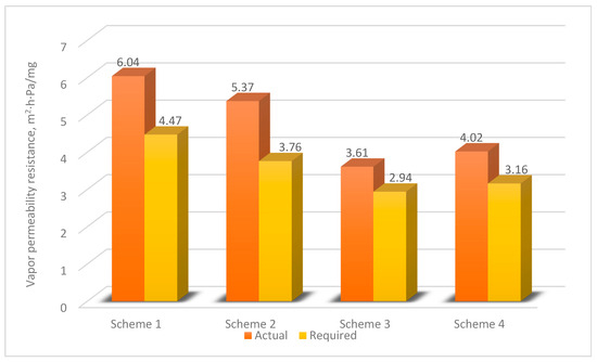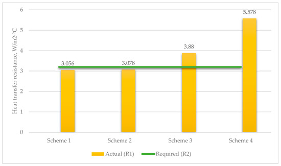 The analysis of thermal performance showed that the required thermal resistance (Rt) for the selected region is 3.2 m2·°C/W [4,25]. A comparison of this normative value with the actual thermal resistances (R) of the studied structures (Figure 3) revealed that the first two panel variants do not meet the minimum Rt requirements. At the same time, Scheme 3 and Scheme 4 demonstrated exceedances of the normative value by 1.2 and 1.74 times, respectively. This confirms that increasing the degree of material variatropy enhances the effectiveness of the building envelope structures in terms of thermal resistance.