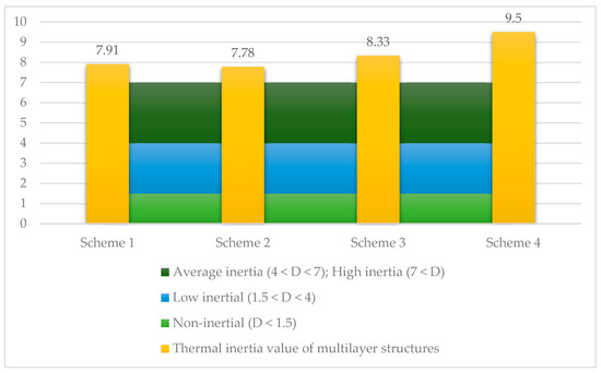 Thermal inertia values of multi-layer variotropic panel structures: (Scheme 1—Traditional type; Scheme 2—Variotropic concrete in 1 and 3 layers; Scheme 3—Variotropic concrete in 1, 2 (two layers), and 3 layers; Scheme 4—Variotropic concrete in 1, 2 (three layers), and 3 layers.