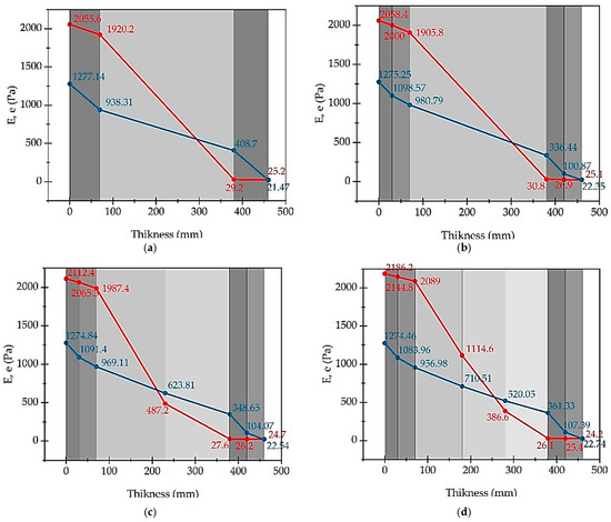 Moisture condensation values in multi-layer variotropic panel structures: (a). Traditional type (Scheme 1); (b). Variotropic concrete in 1 and 3 layers (Scheme 2); (c). Variotropic concrete in 1, 2 (two layers), and 3 layers (Scheme 3); (d). Variotropic concrete in 1, 2 (three layers), and 3 layers (Scheme 4).