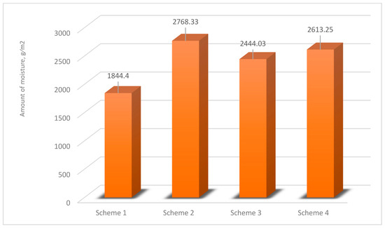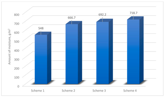 Amount of moisture evaporating from multi-layer variotropic panel structures during the drying period: Scheme 1—Traditional type; Scheme 2—Variotropic concrete in 1 and 3 layers; Scheme 3—Variotropic concrete in 1, 2 (two layers), and 3 layers; Scheme 4—Variotropic concrete in 1, 2 (three layers), and 3 layers.