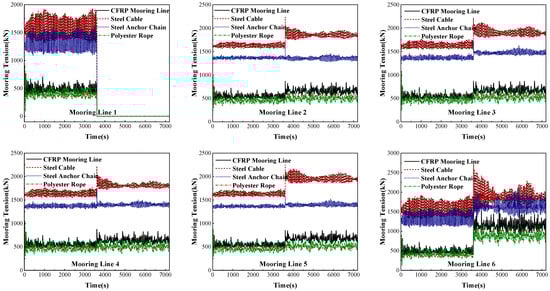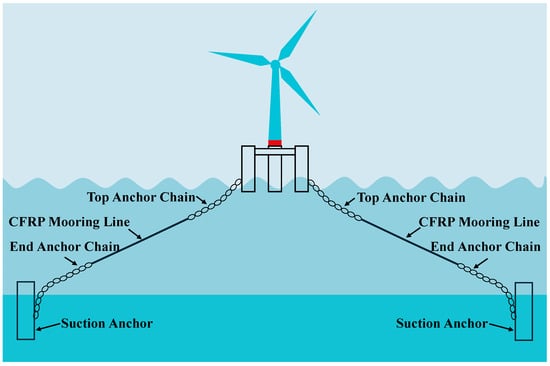 (1) The mooring system composed of a top steel chain segment, a middle CFRP cable section, and a bottom steel chain segment can effectively combine the wear resistance and installation convenience of steel chains with the lightweight and high-strength properties of CFRP material, which ensures both the safety and economic efficiency of the mooring system for offshore floating wind turbines.