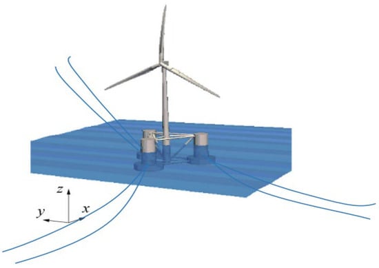 x-axis at 0°. The motion responses and mooring tensions of the floating wind turbine system under combined wind–wave–current loads are analyzed for both normal operating conditions and a once-in-50-year extreme sea state. The wind and wave loads are simulated using the API wind spectrum model and the JONSWAP wave spectrum model, respectively. The relevant parameters are listed in