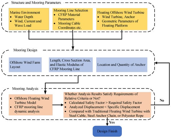 (3) Based on the preliminary design from Step (2), a numerical simulation analysis of the dynamic performance of the offshore floating wind turbine moored with CFRP mooring lines is conducted. Then, whether the simulation results meet the requirements is checked. If not, Step (2) is repeated; if yes, the design is completed, and the numerical simulation results are output.