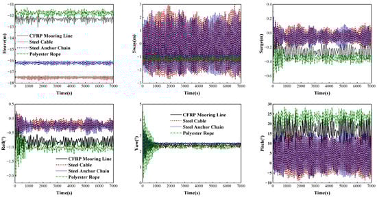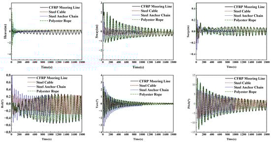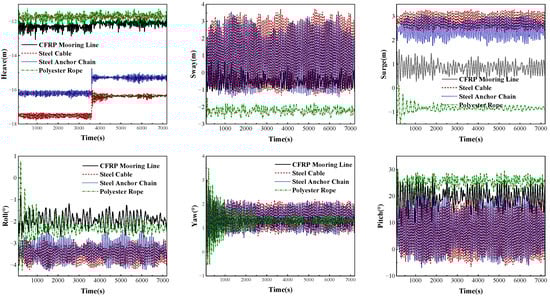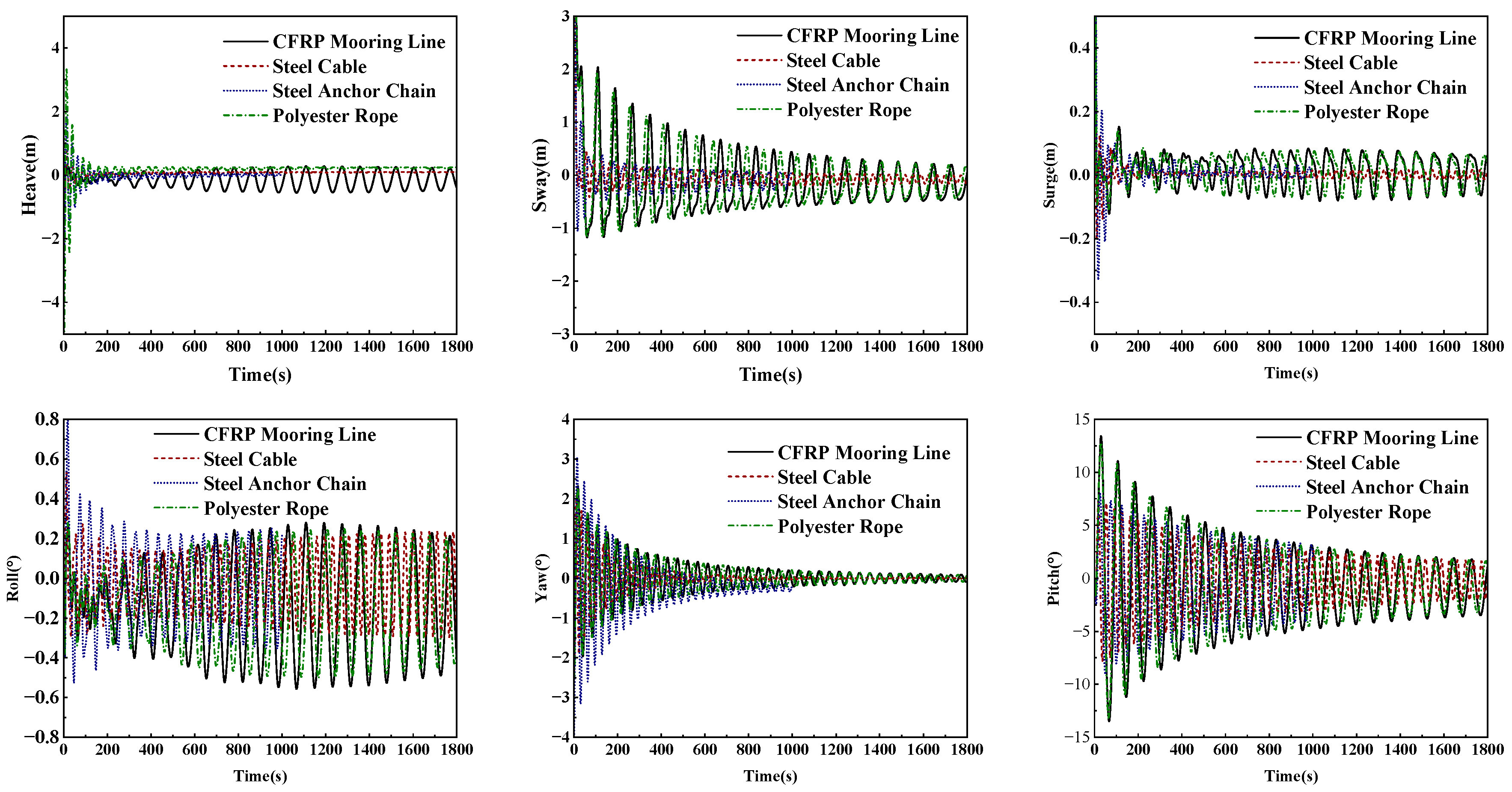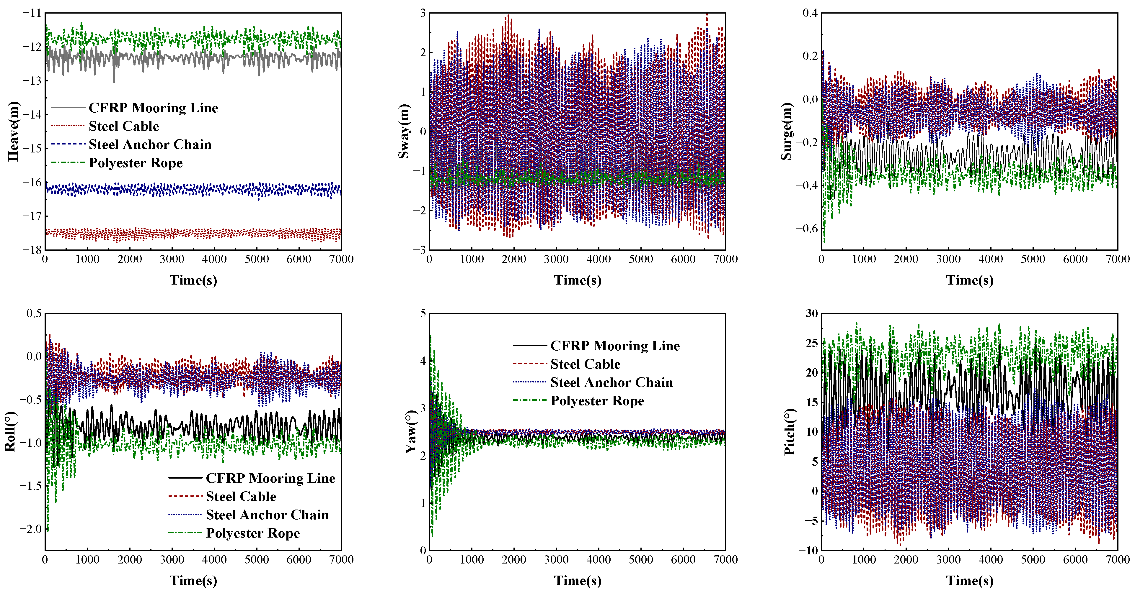 (2) Under still-water conditions, the heave and pitch responses of the floating wind turbine moored with different materials are significant. Due to the low restoring stiffness and light weight, the CFRP mooring system exhibits a larger free decay response and a longer decay duration.
