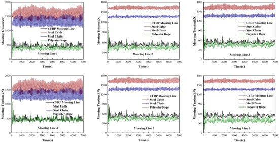 (3) Under operating sea conditions, the motion response and mooring tension of the floating wind turbine with CFRP cables fall between those of systems using steel chains and polyester ropes due to the low elastic modulus and ductility, which can ensure the safe operation of the floating wind turbine.