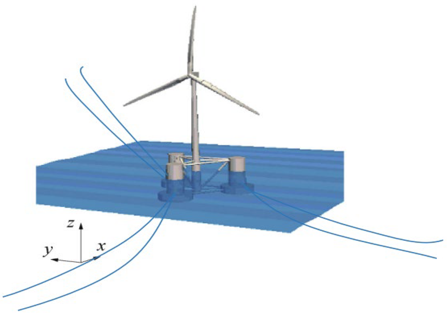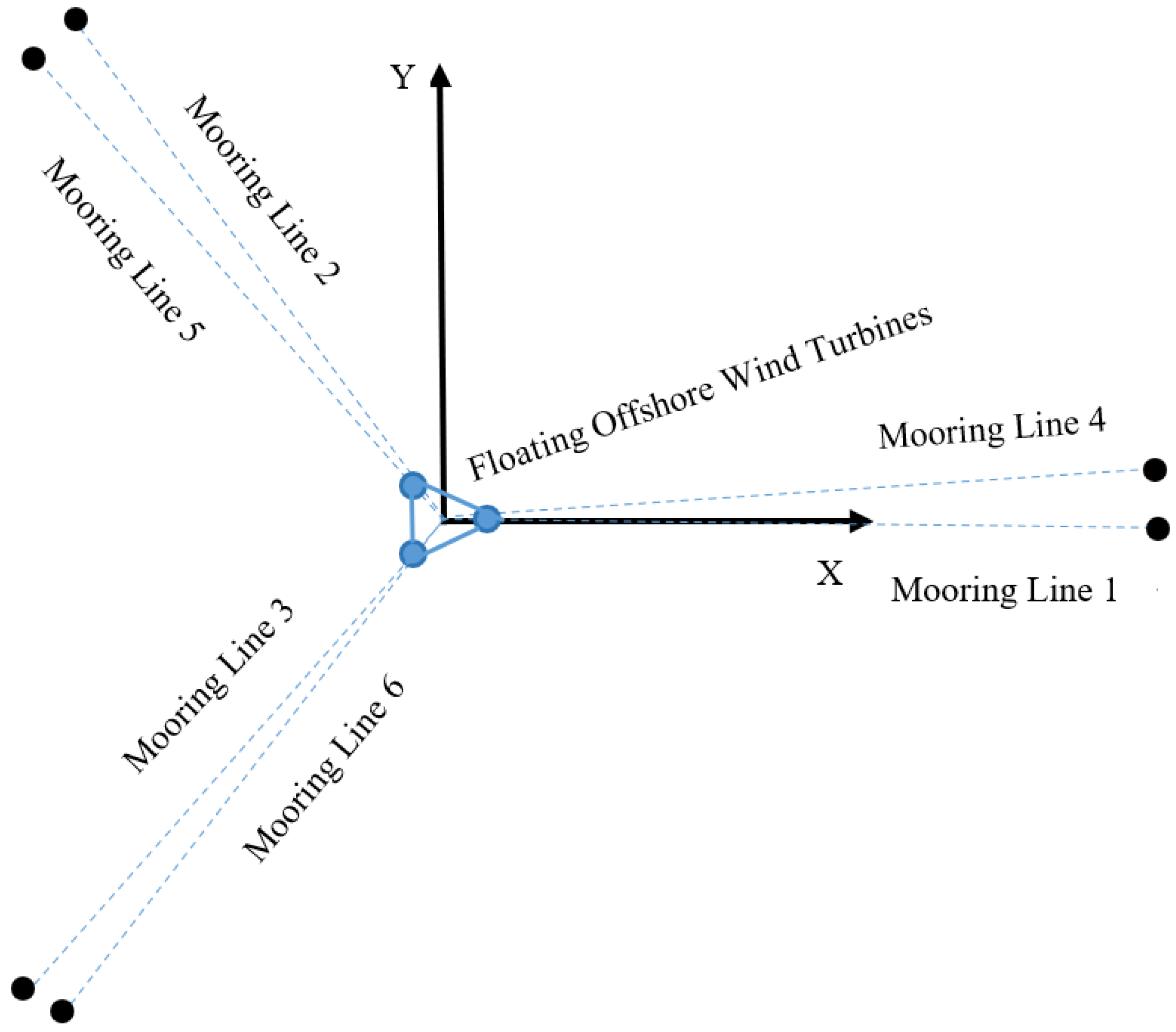 (1) The structural parameters of the offshore floating wind turbine and the mooring system parameters should be determined, including the geometric parameters of the floating wind turbine, mooring line coordinates, environmental load cases, etc., and based on these parameters, a numerical simulation model is established.