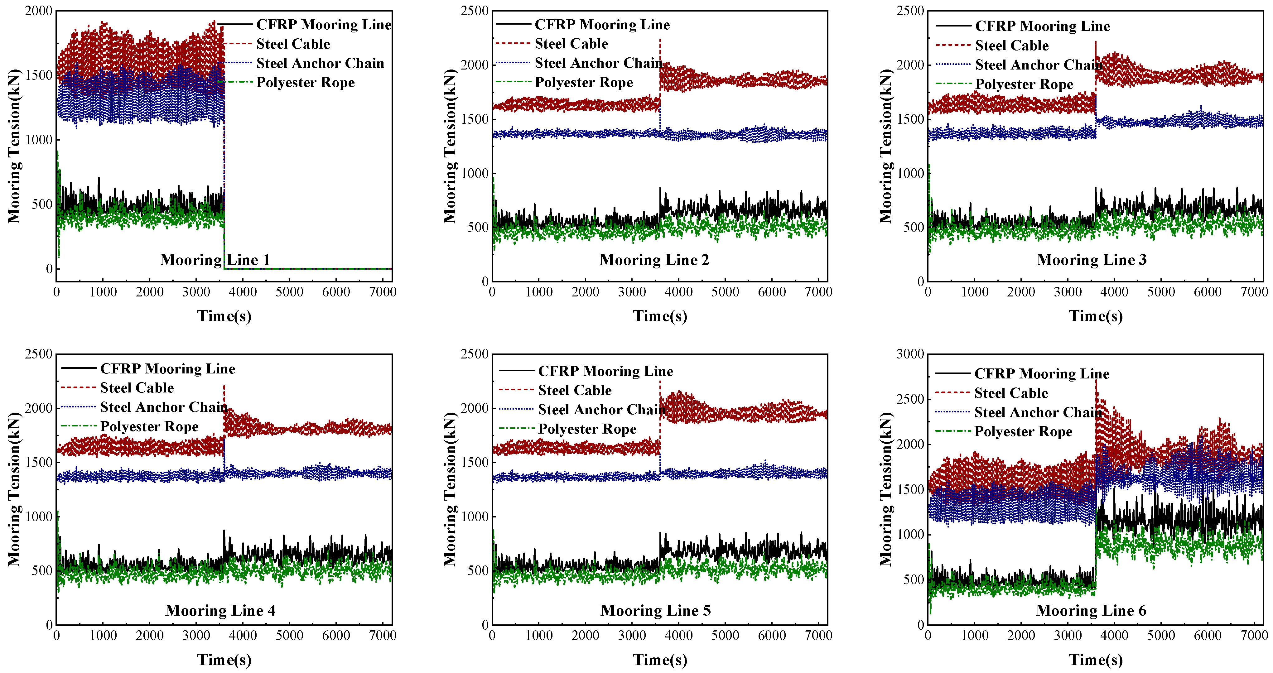 (4) Under extreme sea conditions, the dynamic response of the floating wind turbine in heave becomes more pronounced. The low stiffness and large offset displacement of the CFRP mooring lines can effectively mitigate sharp changes in displacement and tension caused by cable failure. This indicates that the CFRP mooring lines can achieve integrated performances in offshore floating wind turbines as a replacement for traditional mooring systems.