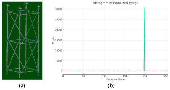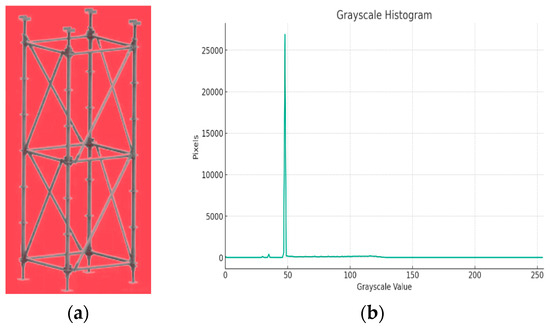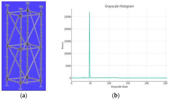 It can be observed from Figure 8 that under the blue background, the grayscale values of the main structure of the cuplok scaffold were predominantly distributed in the higher range (approximately 0–50), while those of the background, shadows, and noise were concentrated in the lower range (approximately 110–200). Through repeated testing and validation on training set samples, a grayscale value of 73 was found to most effectively separate background noise. Consequently, the threshold was set at 73, and the grayscale image shown in Figure 9 was obtained.