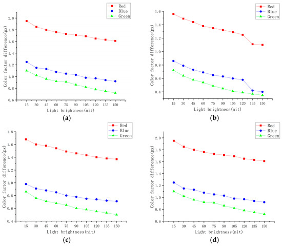 - It can be known from Rod 1, Rod 3, and Rod 4 that as the brightness of the light increases, the color factor difference keeps decreasing and decreases linearly. However, compared with Rod 3, the decrease in amplitude of Rod 1 and Rod 4 was faster. And the color factor difference is lower under the green and blue background; however, against the background of red and blue, member 2 suddenly showed a significant decrease in abruptness. It can be seen that when shooting the rods, a certain distance should be maintained.