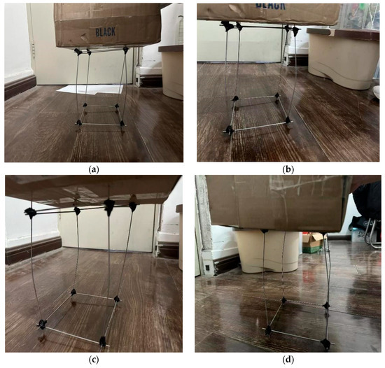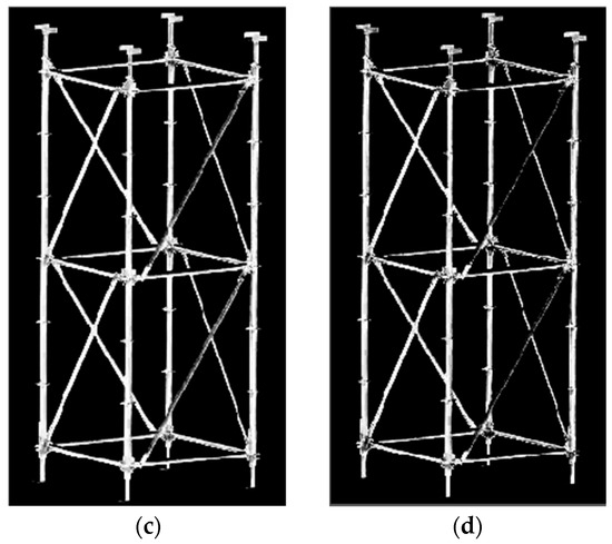 The scaled model members had a length of 80 mm, with longitudinal and transverse spacings of 40 mm, and a diameter of 3.25 mm. The members were made of Q235 steel with an elastic modulus E = 206,000 MPa and a Poisson’s ratio μ = 0.25. An axial pressure of 15 kN was applied. The images were captured using an iPhone 15 under uniform lighting conditions. Shooting began from the front of the support frame, followed by rotating counterclockwise to sequentially capture the right-side, rear, and left-side views. During the filming process, the system performed real-time matching of the member deformation captured within the lens. After each video recording, the member with the maximum deformation was identified, along with its most critical buckling morphology and corresponding bearing capacity. The above shooting procedure was repeated five times to compare the consistency of the identified results. After screening, a total of 300 images were selected for testing. Some of these images are shown in Figure 24.