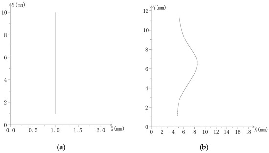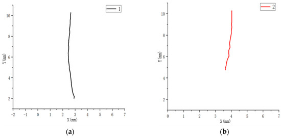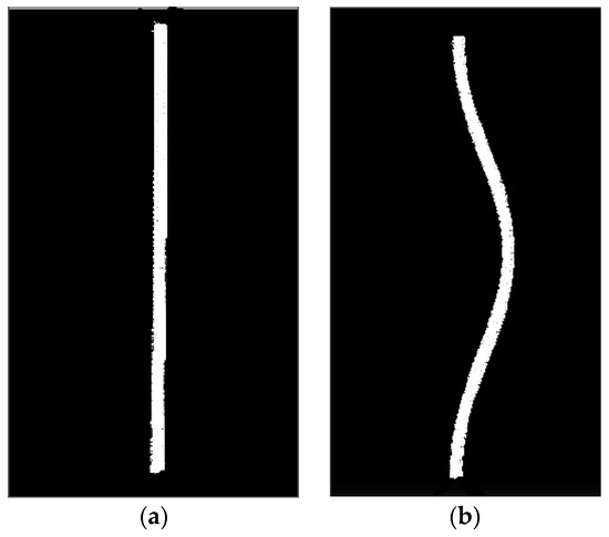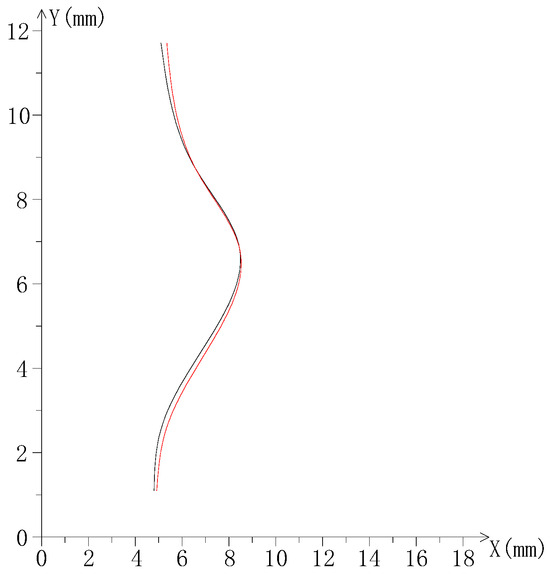 As shown in Figure 22, the red curve represents the result refined by the Zhang–Suen algorithm, while the black curve was obtained through outer contour fitting. The two curves were essentially coincident in the section above the maximum average bending point. Below this point, however, a divergence emerged, with the horizontal coordinate discrepancy between the two curves gradually increasing toward the lower portion of the linear structural member. As the bottom of the member was approached, the contour-fitted curve exhibited a tendency to converge toward the linearized result based on the Zhang–Suen algorithm, and ultimately realigned almost completely at the lowest section.