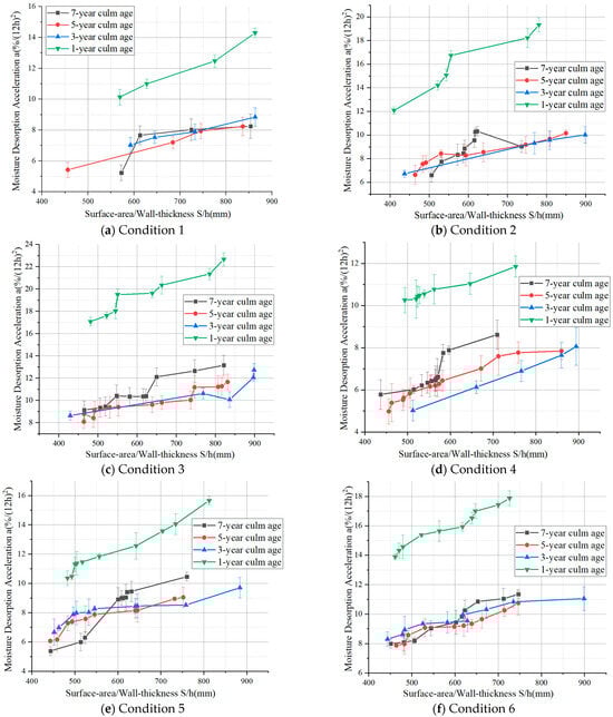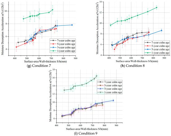 Specifically, under Condition 1 (35 °C/30%RH, Figure 6a), MDA exhibited a positive correlation with increasing surface-area/wall-thickness ratio. Notably, 1-year-old culms displayed significantly higher desorption acceleration than 3-, 5-, and 7-year cohorts. Figure 6b demonstrated that under Condition 2 (45 °C/30%RH), MDA increased with higher surface-area/wall-thickness ratios, while 3-, 5-, and 7-year cohorts exhibited statistically insignificant differences in acceleration values. Under Condition 3 (55 °C/30%RH, (Figure 6c), desorption acceleration generally increased with elevated surface-area/wall-thickness ratios despite minor localized fluctuations, where the 1-year culms displayed significantly higher acceleration than mature cohorts (3-, 5-, and 7-year). In Figure 6d, it showed that under Condition 4 (35 °C/50%RH), the MDA exhibited a positive correlation with increasing surface area-to-wall thickness ratio, with 1-year culms displaying the highest acceleration values. Under Condition 5 (45 °C/50%RH) to Condition 8 (45 °C/60%RH), desorption acceleration similarly increased with elevated surface area-to-wall thickness ratios. While 1-year cohorts maintain maximum acceleration, 3-, 5-, and 7-year culms showed statistically insignificant differences in their response. Under Condition 9 (55 °C/60%RH, (Figure 6i), desorption acceleration similarly increased with elevated surface area-to-wall thickness ratios, with no significant distinction among 3-, 5-, and 7-year culms.