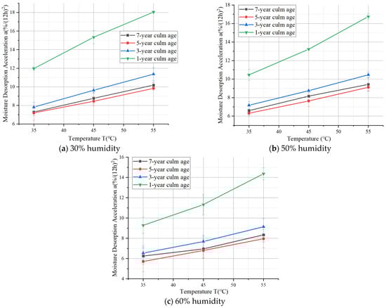 Specifically, from Figure 7a, it can be found that at 30% RH, MDA in Moso bamboo exhibits a near-linear progression with increasing temperature across all culm ages. While at 50% RH (Figure 7b), MDA increased with elevated temperature, with 3-, 5-, and 7-year cohorts displaying essentially linear trends. Similarly, desorption acceleration rose with temperature at 60% RH (Figure 7c), though the growth magnitude was less pronounced than at 30% or 50% RH under equivalent thermal increments.
