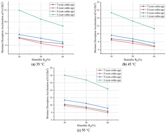 For example, when the specimens were under 35 °C (Figure 8a), the MDA in Moso bamboo progressively decreased with increasing relative humidity, while the rate of decrease gradually diminished. Figure 8b revealed that under 45 °C isothermal conditions, desorption acceleration exhibited a monotonic reduction with elevated humidity. Like the tendency found in Figure 8b, the desorption acceleration of specimens under 55 °C declined with increasing humidity.