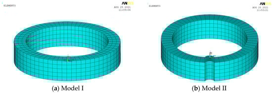Two finite element models were established in ANSYS APDL. Model I comprised an elliptical annulus with a longitudinal length of 20 mm, a major outer axis of 90 mm, and a uniform wall thickness of 10 mm. Six ellipticity configurations were modeled with minor-to-major axis ratios of 0.70, 0.80, 0.85, 0.90, 0.95, and 1.00 (circular reference). Based on experimentally calibrated stress–strain relationships, normal compressive pressures of 1.356 MPa and 1.044 MPa were applied to the outer and inner surfaces, respectively, with positive directionality indicating inward loading. The geometric configuration and mesh generation for the 0.70 minor-to-major axis ratio are illustrated in Figure 9a.