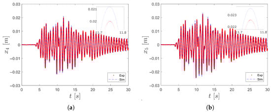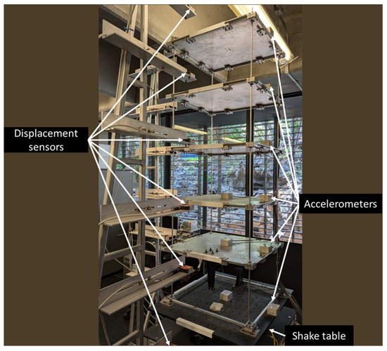 The identification was carried out with experimental data from a reduced-scale five-story building prototype made of aluminum, as shown in Figure 1. Each floor is made up of four columns, three of them made of brass with a square cross section with dimensions of 0.635 cm × 0.635 cm and a height of 36 cm, while the prototype of the building has dimensions of 60 × 50 × 180 cm. The floors consist of an aluminum sheet with adaptations on their sides for measurements, above these sheets, accelerometers are placed on the center and on one side of each floor. In addition, on the first floor. It should be noted that during its assembly, each of the masses of the components was weighed to obtain the concentrated mass of each floor; the measured masses are . Additionally, the reduced-scale structure is equipped with non-inertial accelerometers (model ADXL203E) by Analog Devices Inc., Wilmington, MA, USA. with a measurement range of g and a gain of 0.168 g/V per floor. It also uses laser sensors by Micro-Epsilon, Ortenburg, Germany (model OptoNCDT 1302-200) with a 20 cm range and a gain of 2.511 cm/V for floor displacement. The structure is mounted on a shake table with Parker servomotors (model 406T03LXR), offering a maximum acceleration of 5 g, a speed of 3 m/s, a position resolution of 5 μm, and a free displacement of 250 mm. All devices are connected to a computer with Simulink by MATLAB via two PCI-6221-M series boards by National Instruments, Austin, TX, USA with a 1 ms sampling time.