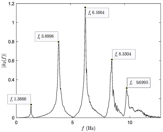 The relationship between stiffness and damping can be expressed in terms of natural frequencies via an eigenvalue problem, as noted in [28]. These frequencies can be experimentally estimated by analyzing the acceleration spectrum from a chirp signal that sweeps from 0.1 to 12 Hz over 20 s. The five natural frequencies are derived using the Fourier Transformation (FT) on acceleration records from the second story, as shown in Figure 2.