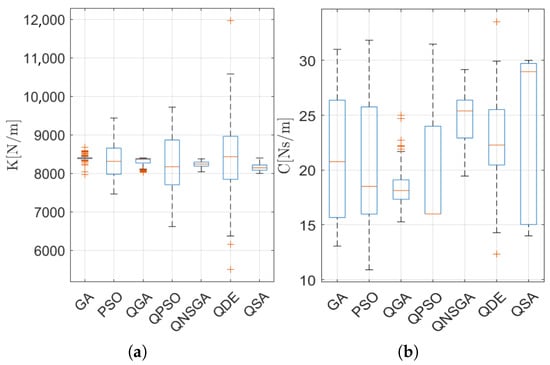 The boxplot for QGA (Quantum Genetic Algorithm) applied to the coefficients of K also shows a small IQR, meaning the dataset is concentrated around a specific range. However, it is asymmetrically skewed downward, with several lower outliers. This suggests that some optimization iterations resulted in unexpectedly low parameter values, possibly due to quantum-inspired variations in the search space. These fluctuations could stem from irregularities in quantum-inspired crossover and mutation mechanisms, leading to some solutions being significantly lower than expected. Conversely, the right boxplot presents the distribution of the damping coefficient, C, highlighting significant disparities in estimation accuracy. Some models reveal a higher degree of dispersion, indicating potential inconsistencies in parameter tuning, whereas others demonstrate relative stability. The comparative analysis of the two distributions indicates that while certain models may show consistent performance for one parameter, they may exhibit increased variability for the other.