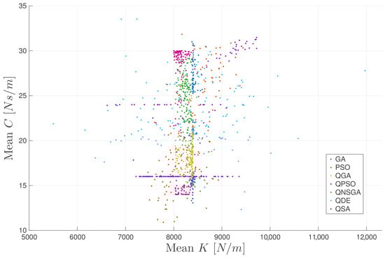 Scatter plot of stiffness (K) vs. damping (C) coefficients in optimization models.