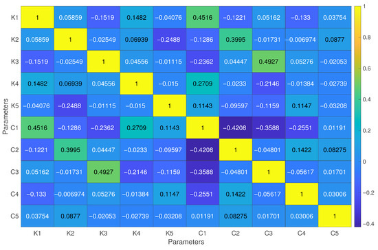 In addition, Figure 6 presents a correlation matrix that provides a quantitative assessment of the relationships between stiffness (K) and damping (C) coefficients across different optimization models. The color-coded heatmap visually represents the correlation coefficients, where values closer to 1 or −1 indicate strong positive or negative correlations, respectively, while values near 0 suggest weak or no correlation. In fact, diagonal elements confirm the expected perfect self-correlation (r = 1). Certain stiffness parameters (K) exhibit moderate correlations with damping coefficients (C), which may indicate structural dependencies influenced by the optimization algorithm. However, the variability in correlation values across different parameters suggests that stiffness and damping are not universally dependent, reinforcing the need for model-specific tuning.