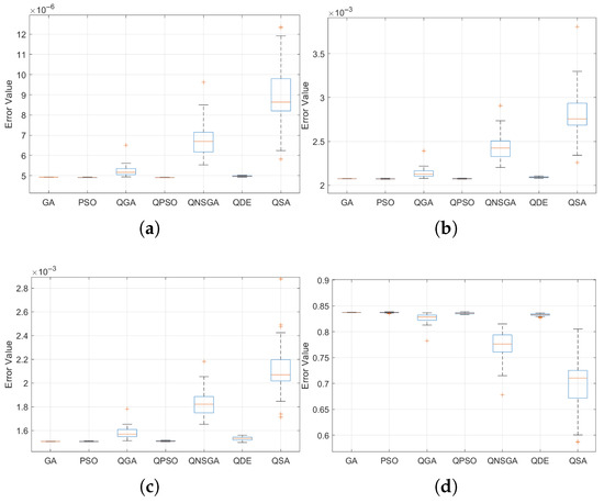 The performance results revealed interesting differences among algorithms. GA exhibited the highest average ranking (26.4%) according to the Borda count in Table 9, while QSA, despite achieving the lowest MSE and RMSE values, had the lowest ranking probability (23.2%). This divergence points to the distinction between accuracy and robustness. While QSA can converge to highly accurate solutions, its variability across runs reduces its overall reliability. In contrast, models such as QNSGA-II and QDE delivered more consistent results across executions, even if their mean errors were slightly higher. This reinforces the importance of evaluating both dimensions when assessing optimization performance: accuracy in individual runs and robustness across repeated trials.