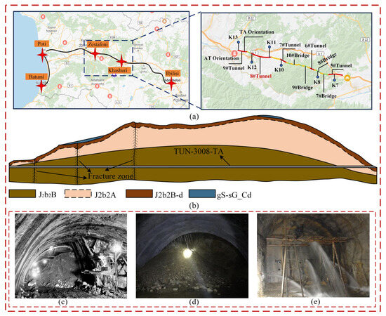 Overview of the 8# TA tunnel in the Georgia E60–F3 section: (a) tunnel location; (b) longitudinal geological profile of the 8# TA tunnel; (c)tunnel collapse; (d)tunnel roof fall; (e) tunnel water gushing mud.