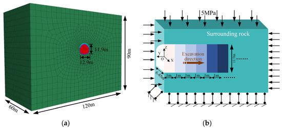 The three-dimensional numerical model was developed based on the construction cross-section dimensions and geological characteristics of the 8# TA Tunnel of the Georgia E60 Highway. The center of the tunnel was selected as the coordinate origin, with the tunnel excavation direction defined as the Y-axis. The direction perpendicular to the Y-axis within the horizontal plane was set as the X-axis, while the vertically upward direction was defined as the positive Z-axis. The clear distance between the vault and invert of the model is 11.9 m, with a lateral span of 12.9 m. Based on the Saint-Venant principle, a model dimension of five times the tunnel diameter was adopted to minimize boundary effects [20,21]. The three-dimensional numerical model extends 120 m in the X-direction, 60 m in the Y-direction, and 90 m in the Z-direction (see Figure 2a). The model is modeled by hexahedral mesh solid elements, which are divided into 59,760 elements and 60,780 nodes. At the same time, the mesh is refined around the tunnel excavation area to accurately capture stress concentration and deformation gradient. The element size of this critical region is set to be much smaller than the expected plastic zone and pressure arch range, thus ensuring the calculation accuracy. The mechanical convergence criterion is adopted in the numerical calculation, which is the standard and strict tolerance to ensure the balance of each step in the finite difference analysis of geotechnical engineering. The general Mohr–Coulomb constitutive model is used in the numerical model of surrounding rock, and its parameters can be reliably obtained by conventional test, which can provide a stable reference for the comparative analysis of this support scheme, assuming isotropic homogeneous material properties while neglecting geological structures and groundwater effects. The physical and mechanical parameters of the surrounding rock are detailed in Table 1. In order to prevent the rigid body displacement and simulate the in situ stress field, the boundary constraint of the model is set as the bottom is completely fixed, the left and right sides are constrained by the X-direction displacement, the front and back ends are constrained by the Y-direction displacement, and the top is set as the free surface. According to the burial depth, the weight of the overlying rock mass was converted into a vertical load applied to the upper boundary of the model. The calculated pressure applied to the top boundary was 5 MPa (see Figure 2b). The simulation of tunnel excavation clearly considers the sequential construction process. The whole section method is used to excavate and advance in stages. Each construction cycle simulates a footage of 1 m.