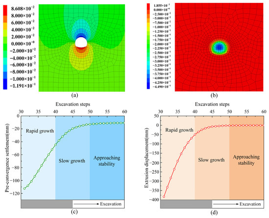 Deformation of surrounding rock at 30 m excavation depth: (a) vertical displacement of surrounding rock (unit: m); (b) axial extrusion displacement of surrounding rock (unit: m); (c) pre-convergence displacement ahead of tunnel face; (d) pre-extrusion displacement ahead of tunnel face.