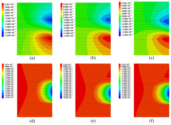 Surrounding rock displacement at different excavation depths (unit: m): (a) 10 m (vertical displacement); (b) 20 m (vertical displacement); (c) 30 m (vertical displacement); (d) 10 m (extrusion displacement); (e) 20 m (extrusion displacement); (f) 30 m (extrusion displacement).