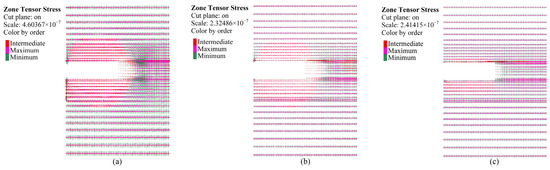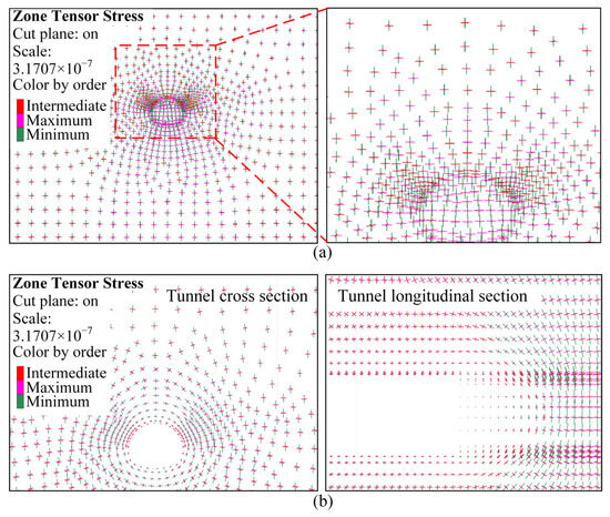 Due to FLAC3D’s convention defining tensile stresses as positive, which contradicts geomechanics sign conventions, this study specifically defines the σmax as the compressive stress with the largest absolute value. The principal stress vector diagram of the surrounding rock before excavation is shown in Figure 5a, where green represents the minimum principal stress, red indicates the intermediate principal stress, and pink segments denote the σmax. The length of each segment corresponds to the magnitude of the absolute stress value. Figure 5b shows the principal stress vector diagram of the surrounding rock at the cross-section when the tunnel is excavated to 30 m. As shown in the figure, in the area adjacent to the tunnel vault, the σmax is oriented horizontally, indicating significant influence from excavation disturbance in this region. As the distance between the surrounding rock at the vault and the excavation boundary increases, the direction of the σmax gradually returns to the initial in situ stress orientation. This demonstrates that at a certain distance from the tunnel, the surrounding rock begins to form a pronounced radial load-bearing arching effect. Concurrently with the formation of this load-bearing arch, redistribution of principal stresses occurs along the tunnel axis within the surrounding rock. This is specifically manifested by significant rotation of the σmax direction in the region proximate to the excavation face.