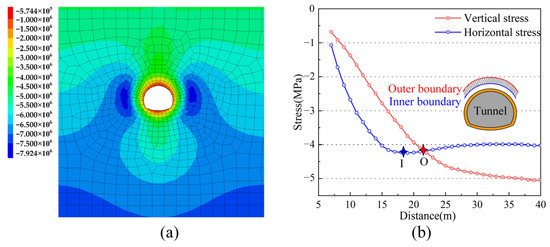 Stress distribution of surrounding rock after tunnel excavation: (a) nephogram of σmax in surrounding rock (unit: Pa); (b) path curves of horizontal and vertical stresses in surrounding rock.