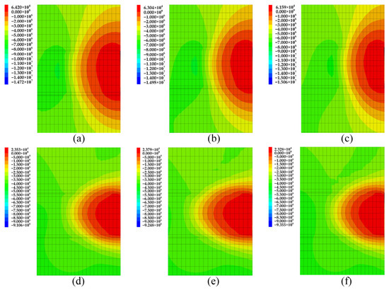 Stress distribution of surrounding rock at different excavation depths (unit: Pa): (a) 10 m (SZZ stress); (b) 20 m (SZZ stress); (c) 30 m (SZZ stress); (d) 10 m (SYY stress); (e) 20 m (SYY stress); (f) 30 m (SYY stress).