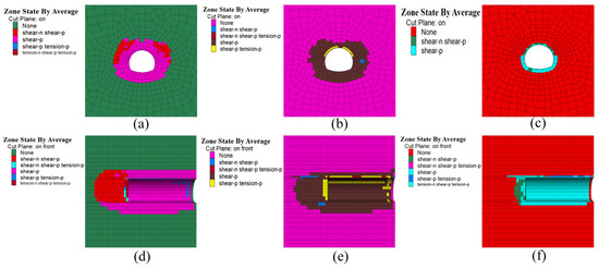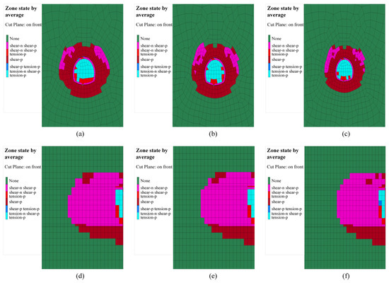Distribution of plastic zone in tunnel surrounding rock under different conditions: (a) cross-section of condition 1; (b) cross-section of condition 2; (c) cross-section of condition 3; (d) longitudinal section of condition 1; (e) longitudinal section of condition 2; (f) longitudinal section of condition 3.