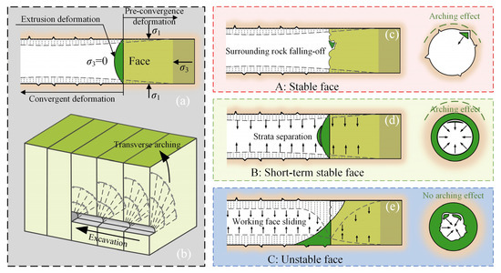 In type A (stable) surrounding rock, the rock in front of the face after excavation remains primarily in an elastic state and possesses sufficient bearing capacity. Consequently, the unexcavated tunnel face (or the surrounding rock ahead) exhibits extremely minimal deformation and demonstrates high self-stability. Such rock masses may only undergo centimeter-scale elastic deformation or experience sporadic and isolated rockfalls. Owing to the high self-stability and negligible the tunnel face deformation, the arching effect can form and function effectively in close proximity to the excavation boundary (see Figure 9c). In type B (short-term stable) surrounding rock, the rock ahead of the face transitions into an elastoplastic state after excavation, exhibiting limited bearing capacity. Consequently, the tunnel face undergoes elastoplastic deformation toward the tunnel cavity while still maintaining basic stability in a short time. The surrounding rock may experience decimeter-scale deformation or localized spalling. If support measures are not implemented promptly, continuous stress release in both radial and longitudinal directions will occur, leading to progressive expansion of the plastic zone ahead of the tunnel face. The development of this plastic zone undermines the bearing capacity of the near-field surrounding rock, forcing the formation position of the “arching effect” to shift deeper into the rock stratum farther from the excavation boundary (see Figure 9d). In type C (unstable) surrounding rock, the rock ahead of the face rapidly transitions into a failure state or becomes unstable along potential sliding surfaces, with its self-bearing capacity fundamentally lost. Consequently, the tunnel face exhibits severe and uncontrolled deformation, becoming highly unstable. Due to the extensive failure or sliding of the surrounding rock, it can no longer form an effective natural arching effect (see Figure 9e).